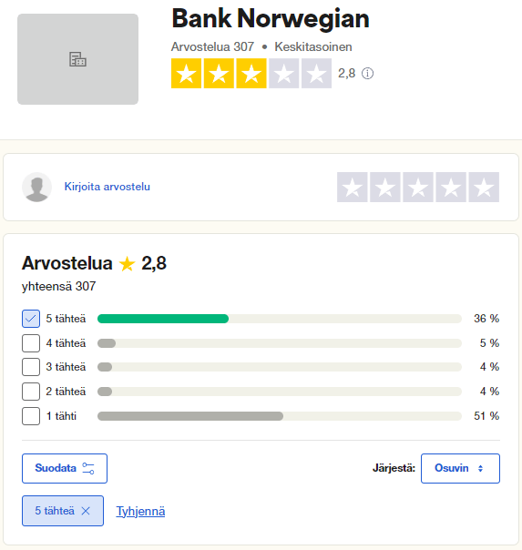 Bank Norwegian on luotettava ja vakavarainen toimija, joka kerää asiakkailtaan pääsääntöisesti erittäin hyvää palautetta.