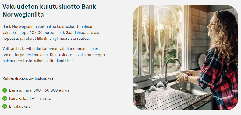 Bank Norwegianin kertaluonteista vakuudetonta kulutusluottoa voi hakea 5 000–60 000 euroa. Lainan maksuaika on 1–15 vuotta.
