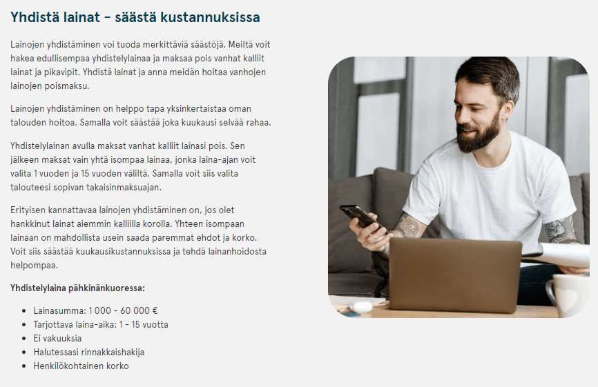 Yhdistelylainaa voi hakea 1 000–60 000 euroa 1–15 vuoden maksuajalla. Kuten kulutusluotolle, myös yhdistelylainalle määritellään henkilökohtainen korko.