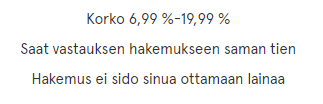 Sekä kulutusluoton että yhdistelylainan korko on aina henkilökohtainen, ja se määräytyy haetun lainasumman ja lainanhakijan tietojen perusteella. Nimelliskorko voi olla välillä 6,99–19,99 % välillä.